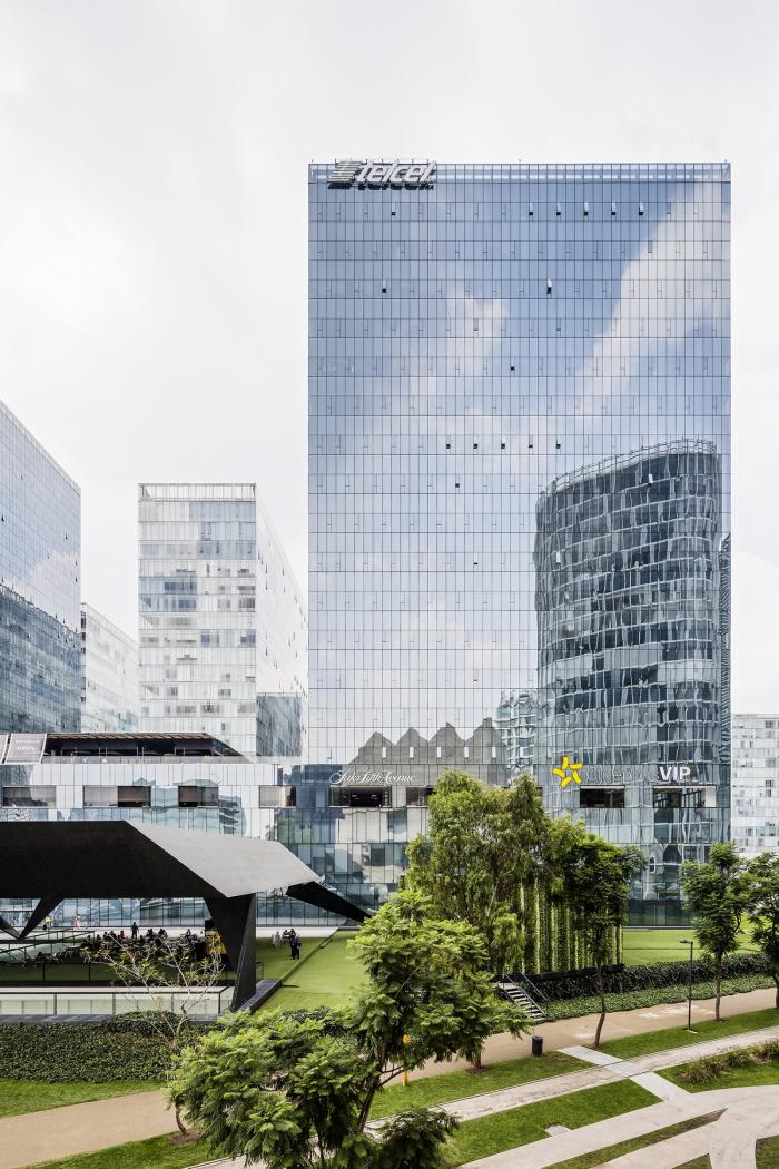 可持续发展是卡尔索广场总体规划的一个关键要素。所有建筑立面都由低能耗玻璃板组成,这些玻璃板是根据国际准则专门制造的。水的收集、过滤和分配使用了先进的废水回收技术,包括拉丁美洲第一个规模相当的冷却发电水厂,以及高效的雨水收集系统。总体规划中,超过50%的场地用于绿地和开放空间,包括一条10公里长的绿色走廊,这条走廊最初是为了一场吸引了世界上许多最著名的景观设计师的国际竞赛而设计的。