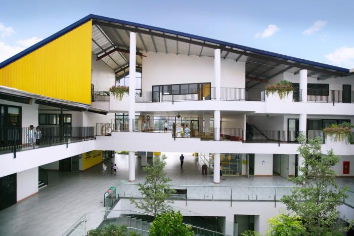 这所学校包含许多通用空间:实践教室,技能教室,剧场,四季游泳池,室内外体育场,水上花园等,通过操场和草地相互交织在一起,满足了孩子全面发展的需要。