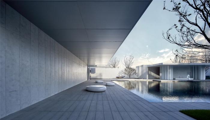 “泊”是许多人对回家的定义。因此我们将水意向化引入基地,结合建筑形成社区入口半公共的庭院空间,作为自然景观与居住空间的转折,也作为城市维度与建筑维度的耦合点。水院的设计不流形式,但求性格。我们解构了传统居住空间院落的进与路,把传统空间的秩序抽象为空间的层级。