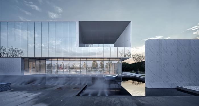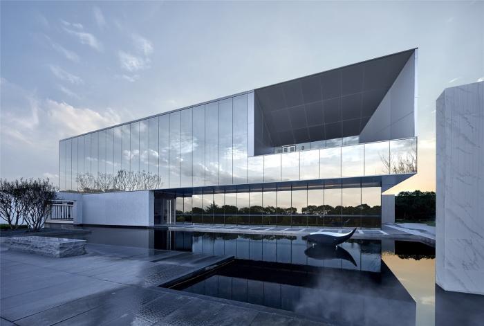 我们用硬挺的铝板线条勾勒出建筑主体框架,7.5m通高镜面玻璃模糊了实体与空间的界限,作为填充框架的皮肉存在,创造出建筑与环境融合对话的和谐感。首层混凝土质感的敦实体量托起悬空之姿的晶莹玻璃体,强烈的虚实对比引起赋予建筑趣味,展现了富有动感又不失现代特性的形体张力。