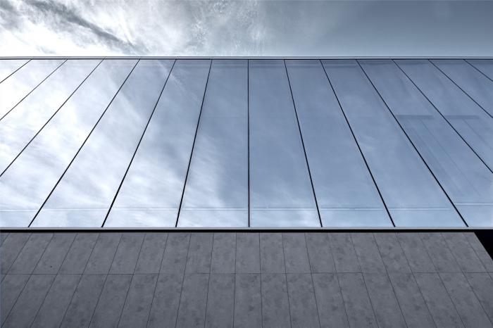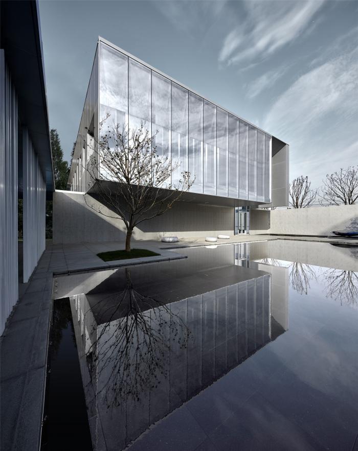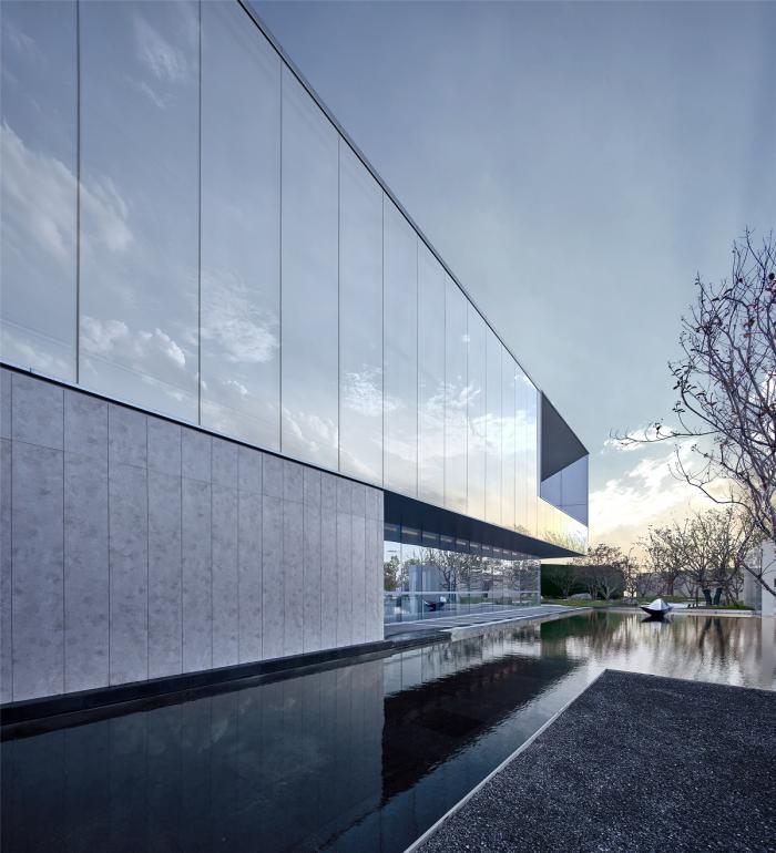 建筑的矛盾性与复杂性不仅仅是一种空间理论,更在实践中时时刻刻影响着建筑呈现的品质。对于建筑效果的追求最终必须通过精细化设计落到建造的各个环节当中,每个细节都值得反复推敲。建筑表皮7.5米通高镜面玻璃是形成建筑形象最重要的构图元素。玻璃的安装方式为上下固定模式,与建筑主体脱开形成空透轻盈效果。日间,镜面玻璃对天空、云朵、树木的反射营造“云深不知处,只在此城中”的错觉;在夜晚,空腔内上下结构外包裹的斜面铝板,被暗藏式灯光照射打亮,更显精致细腻。