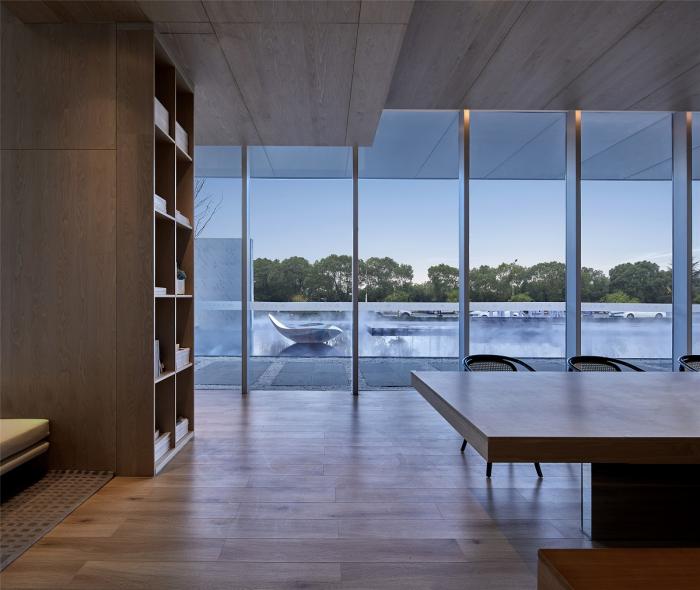 完美的长方体体量在某些界面深挖大洞,形成阳台和入口,营造出建筑界面的戏剧性变化。洞口分别朝向董铺水库和大蜀山的方向,表达建筑对于自然空间的敬意;而洞口的斜面则引导人们产生探索建筑内部空间的兴趣。这些富有寓意的设定暗示着建筑与外界环境深切的沟通欲,进而加强了建筑的内外互动,让建筑、室内和景观从空间情感上联系为一个整体。