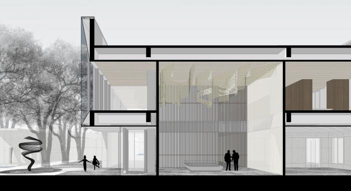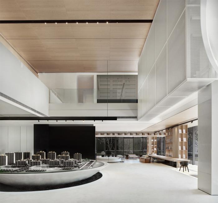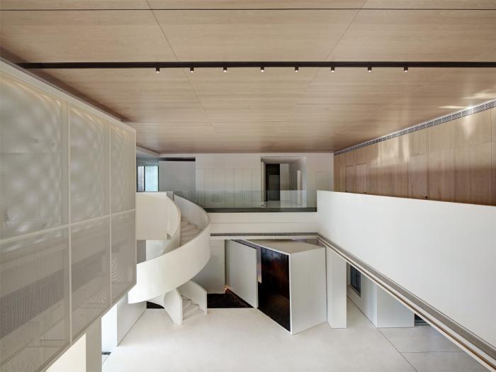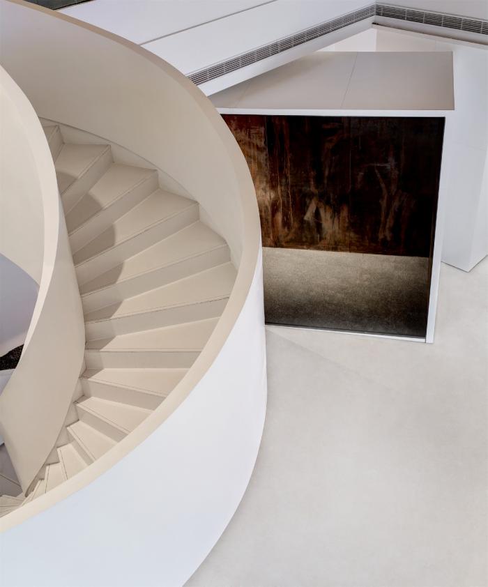 室内空间延续了建筑的设计语汇,利用几何形体和材料质感创作处比例和谐的构成特质。在光线手法上,空间上部广线朦胧,下部通透而实现开场,设计师通过这种空间规划,将观览者的注意力集中在需要表达的事物之上,引导参观者的视觉和触觉体验按照既定路径行进。
