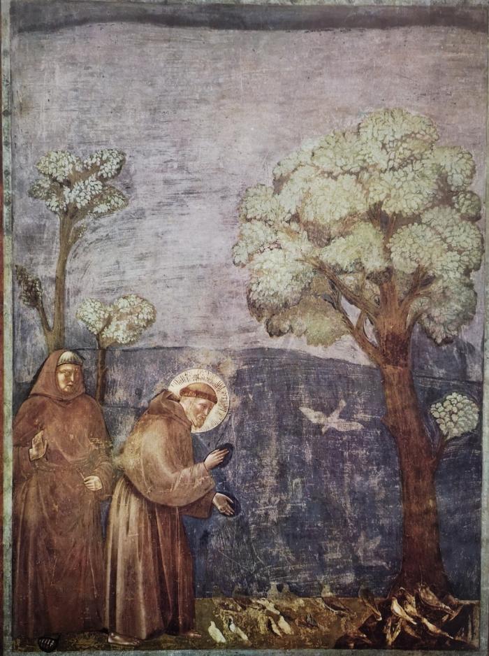北周过了750年后,出现了第二张壁画,这就是在意大利ASSISI小镇San Francesco大教堂里,乔托描绘的28幅湿壁画之一,它叫做《圣方济各向小鸟说教》。绘制于1330年。从此,乔托拉开了文艺复兴的大幕,巨星辈出。但,这幅壁画正如傅雷所说: