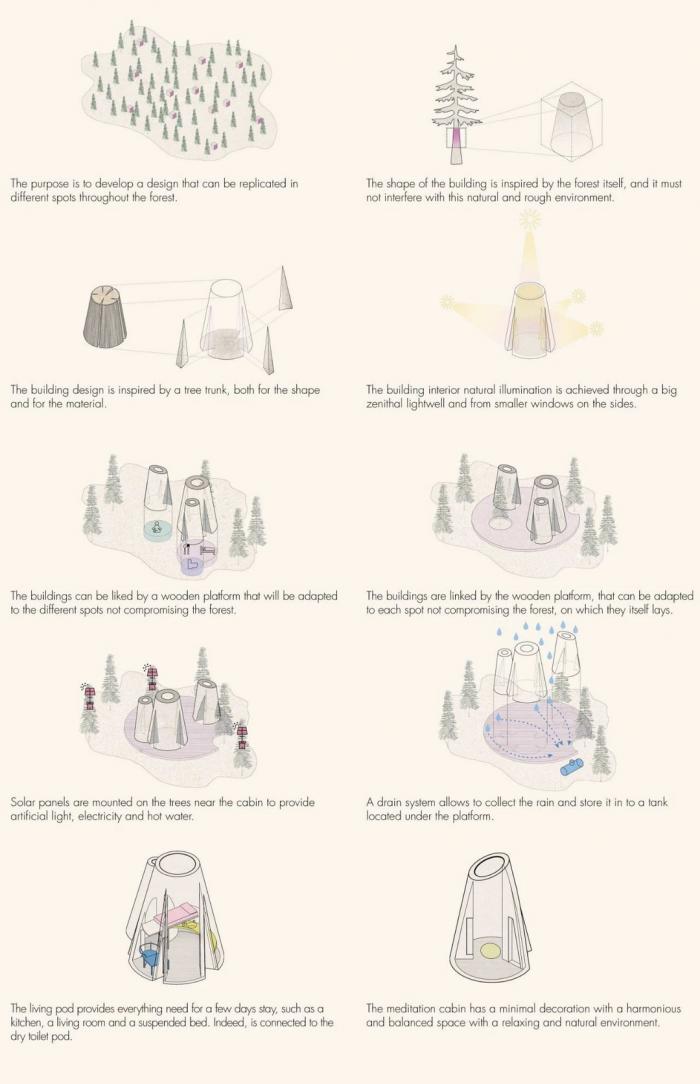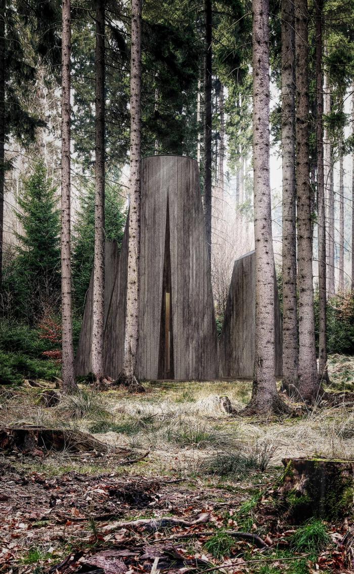 冥想空间所呈现的状态,是根据拉脱维亚这片森林自然而原生态的环境来构思的。这小屋要与森林建立紧密的联系。一个想法就是创造一个可以复制并且适应森林中任何环境的小屋。它应当具备可随处散布于丛林之中的普及性。而这个想法不能仅仅通过颜色和材料来实现,而是必须找到一种姿态和场景,这个姿态场景不仅融于自然环境,更重要的是,它要成为自然的一部分。
