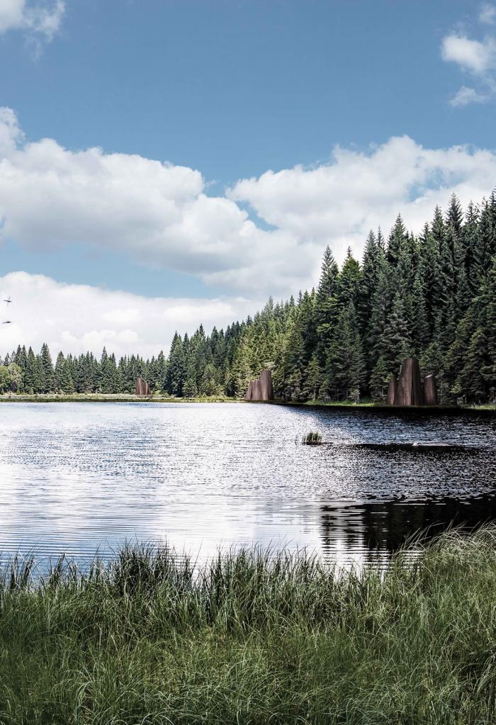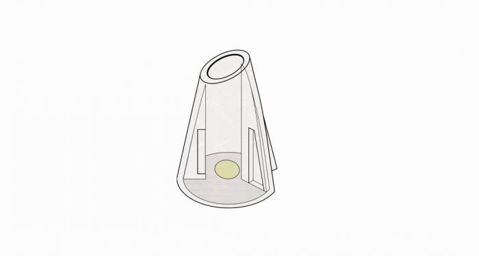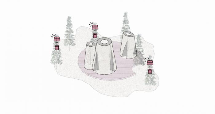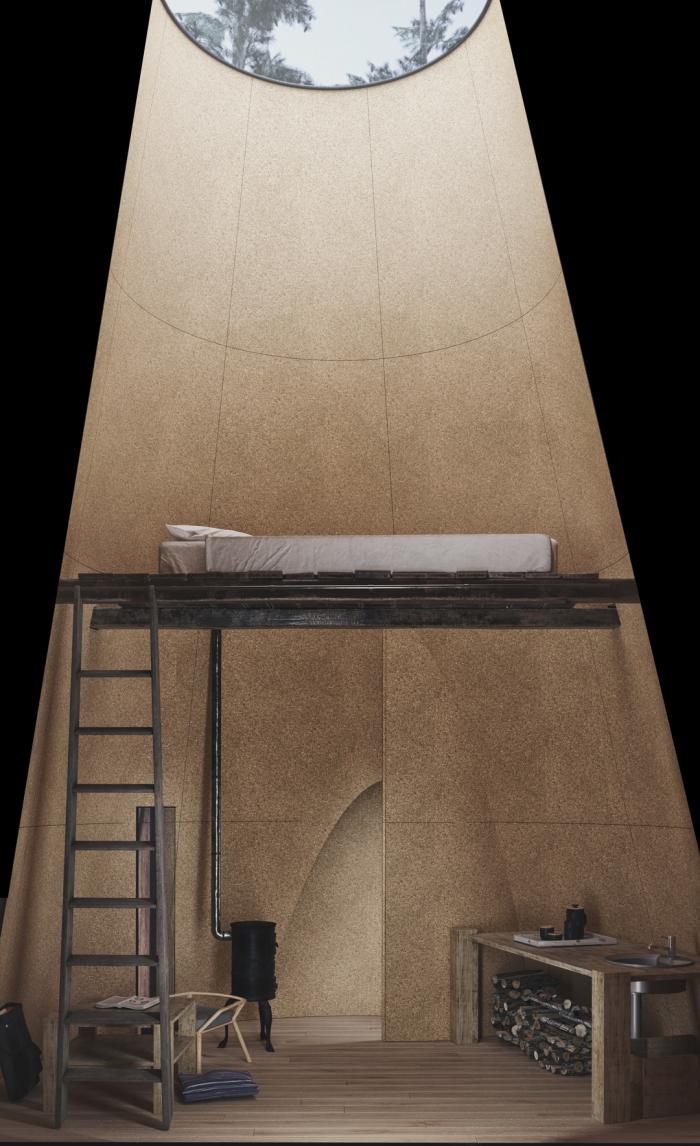 为了实现这个想法,我从这片森林的主要元素(树木)中获取灵感。也就是,联想到北欧松树的树干姿态特征,创造一个“树内空间“。同时,这个树内空间应当具备西方人文语境中的冥想特质。据此,构思了一个非常简洁的圆锥形态,而这一形态几乎可以消隐在森林中。