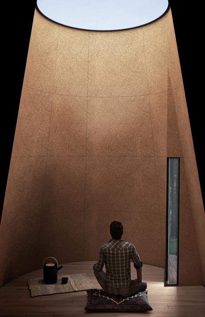 冥想室就这样形成,它是一个小而安静的地方,没有令人不安的元素,专注于人在其中的自我探索。侧边窄长的窗户,是周围环境的微观取景器,以便在繁杂的森林中可以专注于局部一枝一叶的动向,这样的感悟或许更为深刻。