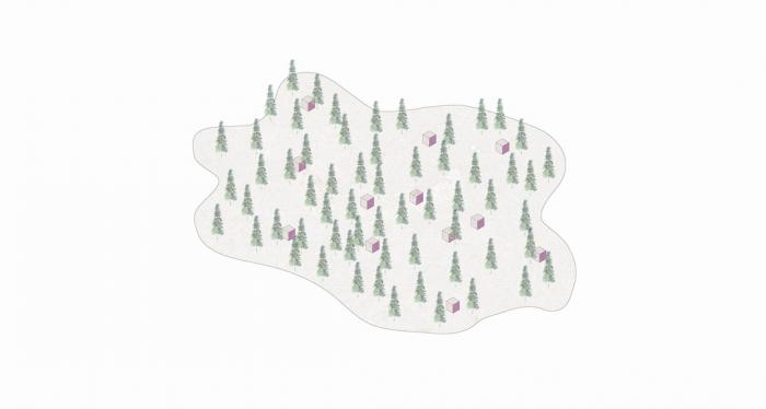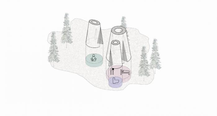 如果仅仅从功能方面考虑,由于需要有一个安静独立、不受干扰的空间供人冥想并与自然重新联系,我们选择拆分和重组功能。住宿空间、辅助空间以及冥想空间分别是独立的建筑单元。