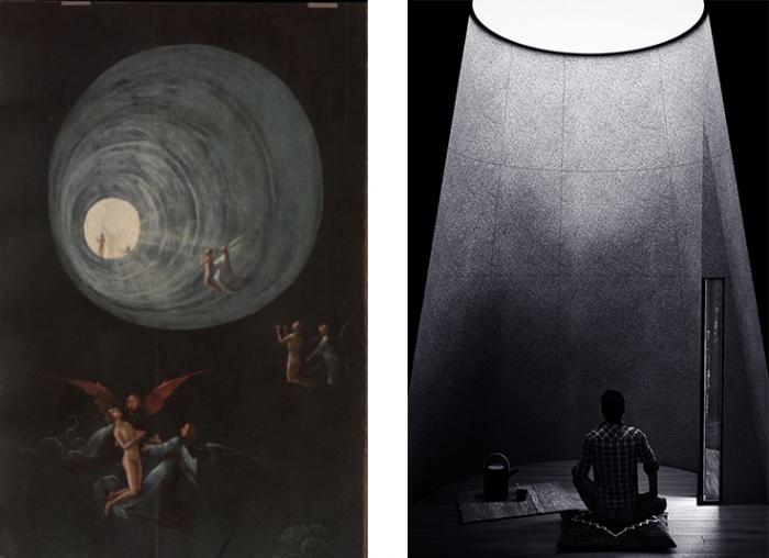 天堂之口,辐射漏斗的空间形状,尽头的天外白光,这些促使我又将缪斯·博世的通往天堂的大通道旋转90度,然后融于现实的森林之中,这便是冥想屋内部空间最纯粹的原型。