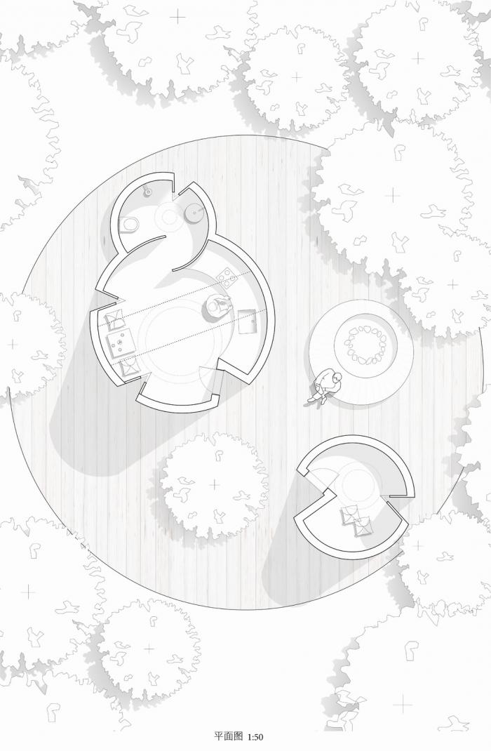 注意,床被悬挂起来。一方面,故意希望人产生爬上爬下的活动方式,这是一定程度上的原始性和自然性的回归,这方式时刻告诉我们正生活在一片森林中,而不是智能化的都市之中。一方面,希望起居入睡变得更具一点仪式感,因为仪式感是人过去的慢生活中曾拥有而现在的快生活中已基本缺失的重要习惯。我希望在这里节奏可以慢下来,这与起居方式密切相关。另外重要的一点是,睡觉的人在视觉上更为接近顶部的圆洞天窗。同时,这个天窗和床铺构成了另一个层面的寂静场所,在这个场所中,视线开阔,光线充足,景观空旷。其实这样的生活视角与城市生活完全不同,相对来说,在城市中,我们的生活视角大多数是平视或者俯视。包括光污染在内的种种因素,城市的天空可看无几,除了划过的飞机。当然从空间利用率上,下层空间得以解放,可充分利用。