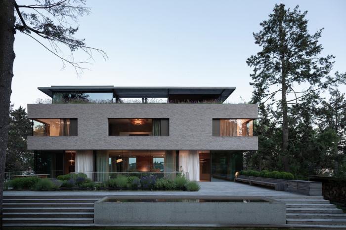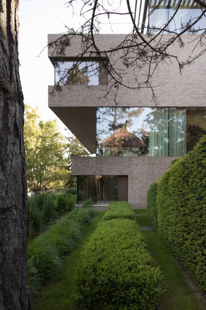 不规则接缝的砖表皮的运用增强了整个建筑的水平感。最高处的屋顶露台,带有完全由玻璃装饰的小型上层构造,有高屋建瓴之势,被生长着多年生植物的屋顶花园所环绕。简洁的几何结构和嵌入倾斜场地之中,坚固而中空体块的分层理念,增强了这座5层宅邸的整体感。