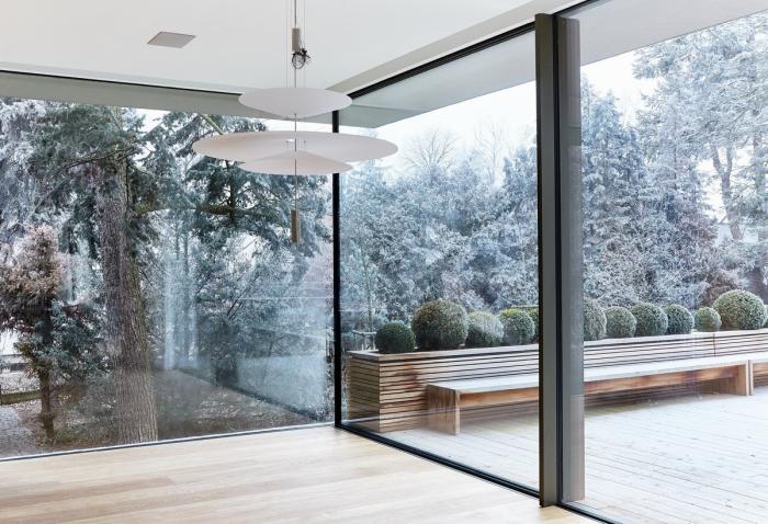 房屋后面巨大露台上的中庭同样遵循了与四层建立视觉上的相互联系的原则。在这个全部以玻璃装饰的中央空间上方,人们会看到那雕塑般的漂浮体块,与底层空间半嵌入二层一样。两个比例匀称且有水平角窗的巨大体块仅通过独立的玻璃就标示出了向外部开放的生活空间。