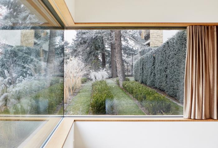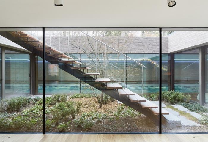 延伸至外部花岗岩覆盖的庭院中的最底层的体块——入口和车库完全嵌入露台之中。二层平面也是半嵌入式的。地面层的面积最大,并构成建筑的基座,装有玻璃的主要的生活空间位于其上面,室内光线充足,周围被大树环绕。该中央生活空间通过两个内部走廊也向房屋的底层和上层开放。