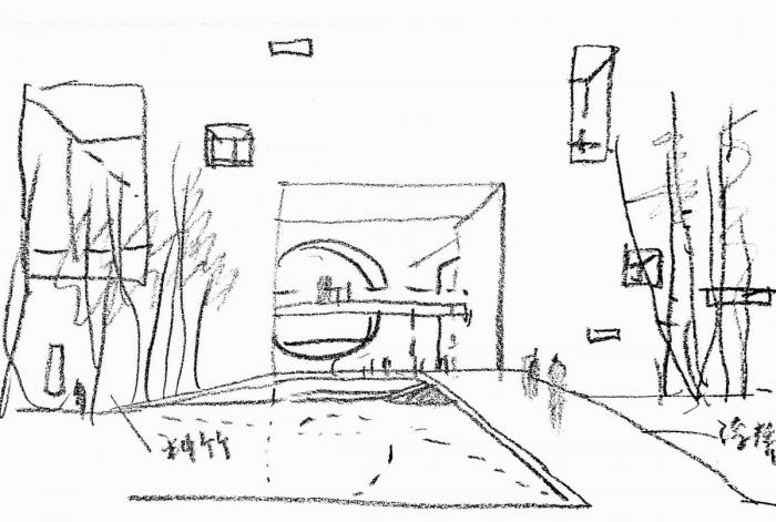 最早的草图清楚地表达了多个尺度各异的院落被置于相对方正、封闭的矩形块之中,一条蜿蜒起伏,时上时下的公共廊道将它们串联起来。每一个功能拥有两到三个内院,建筑主入口的前院尺度较大,形成了一个公共广场,意味着寿县民居中的“堂屋”,建筑后部的后院又有着寿县民居中“后花园”的味道。这条漫游环道,引导着人们缓步桥上,穿越水面,步入建筑之中。从前院开始,在不打断室内连续性的前提下,人们可以穿梭游览于,布满了很多内院的整个建筑。沿着这个可遮阳避雨的环形廊道,参观者时而在一层,时而又到了二、三层,空间变幻莫测,光影时明时暗,去探索发现令人意想不到的惊喜,感悟“藏、息、修、游”所赋予中国传统建筑的艺术精神。