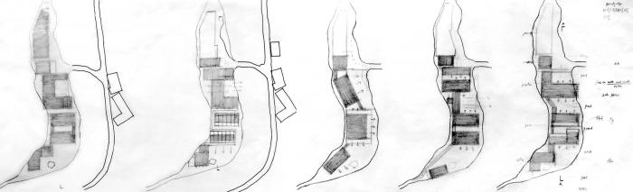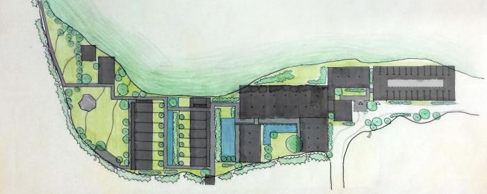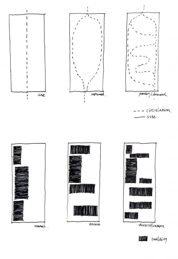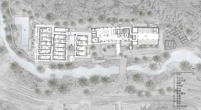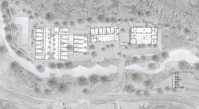 设计以类型学将公共栋与客房栋分为多栋,化整为零来布局,以此弱化面积过大所带来的庞大体量。最终设计布局是在对多种可能性进行尝试之后,最恰当的设计结果,各栋建筑或垂直或平行在场地内,其间的尺度和排布方式也呼应着周边的自然村落。