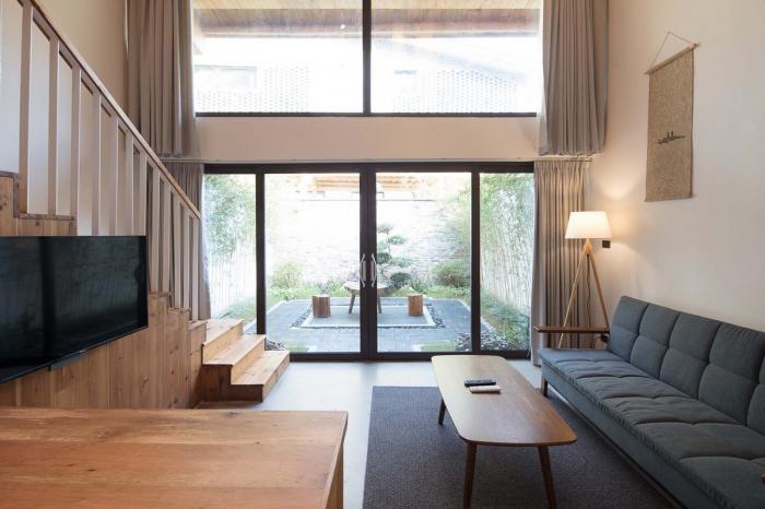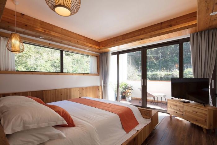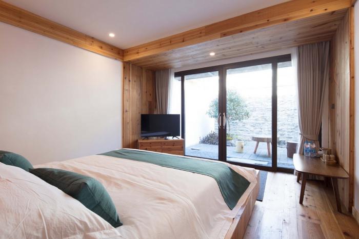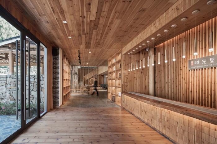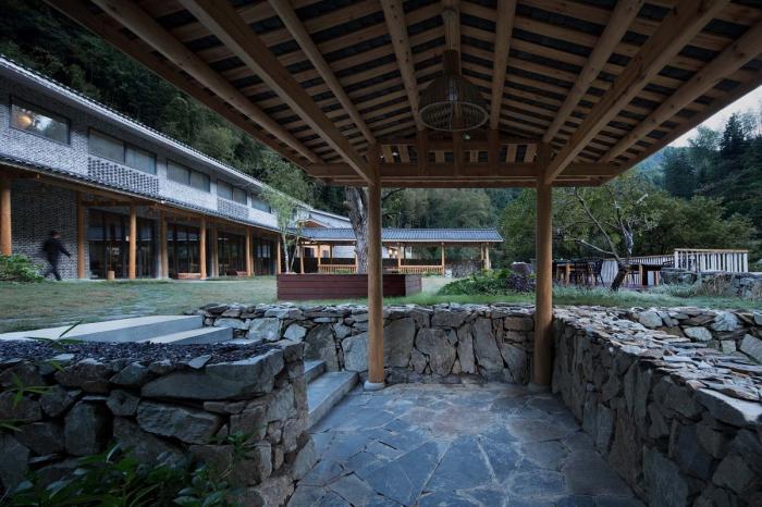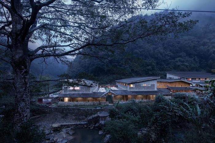 由跨溪石桥入柴门,迂回的动线设计让来访者的视线在远山、巷道、院落间转换。在空间里营造步移景异、曲径通幽的游村之趣。建筑背山面谷,四周树木葱郁,远山美景可观,潺潺溪流相邻,在不同的时间里,透过不同的窗口,都是不同的风景,也都是整幅无框山野的自然画卷。