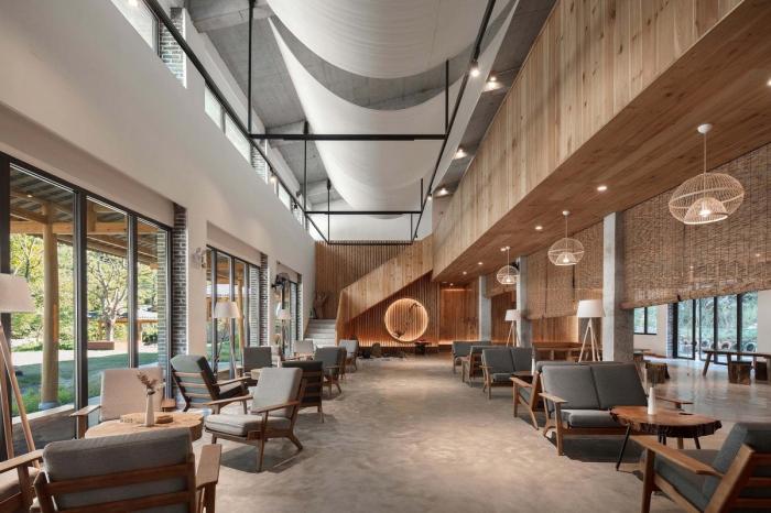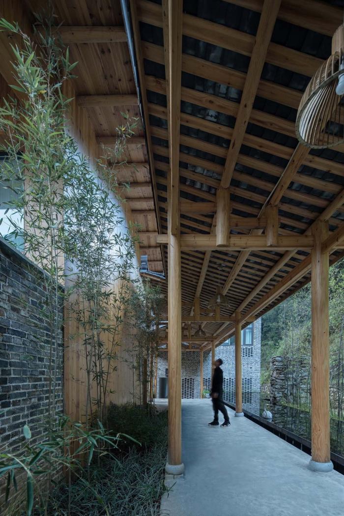 各栋的屋顶交错,连廊相通,建筑如从山中生长出来,以最当地地方式贴合于场地,隐现于景观。