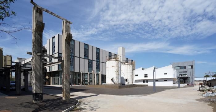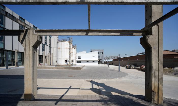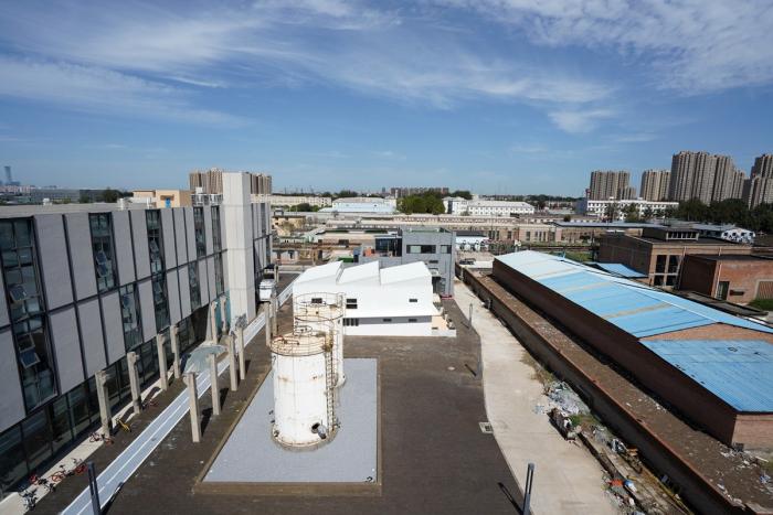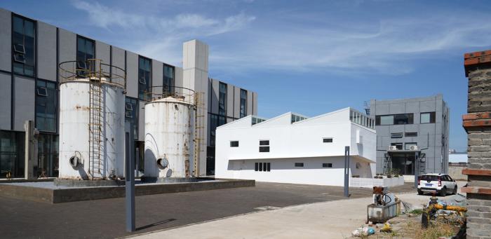 项目位置在北京东五环外,属城市边缘地带。所在文创园区的前身为某化工厂。厂区肌理稀疏,建筑之间的距离较大,构筑物和建筑体量多为简单的几何形体。改造对象位于园区东南侧,属于园区体量较小的建筑,与南侧两个白色的工业罐体围合出一个小型广场。