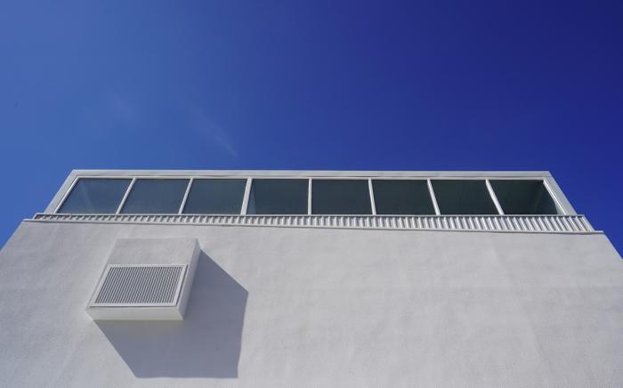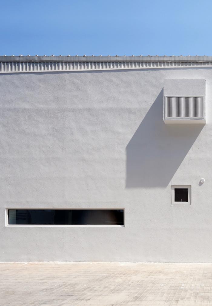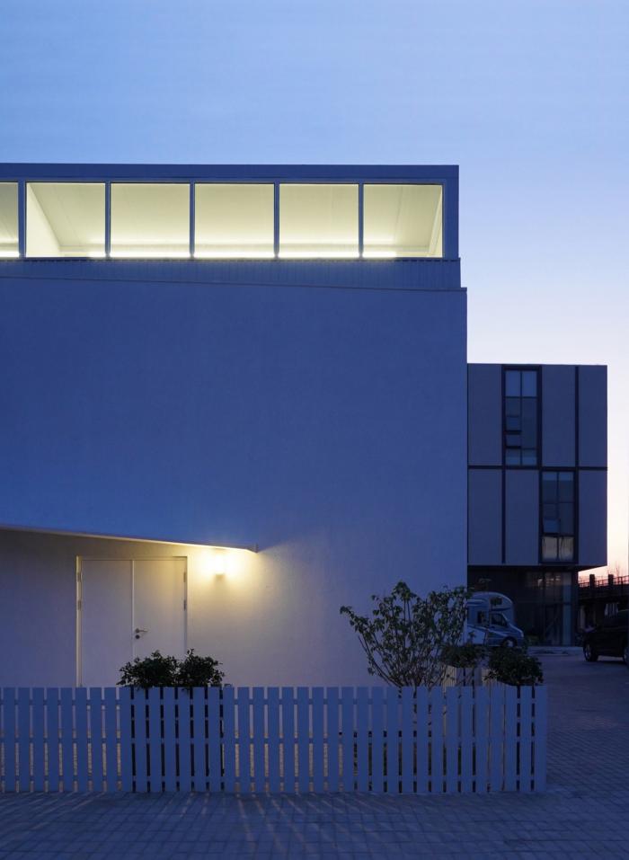 外墙与屋顶整体呈白灰色,与两个白色罐子在一起,像是由几何体形成的一组“素描静物”,随着日升日落,形成丰富的物体与光影的组合图景。