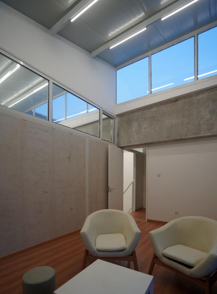 室内一面通高的主隔墙将内部空间做南北划分,北侧高耸的大空间,非日常的尺度有利于人的状态转换,放大的人均空间体量给思维以自由天地;南侧划分为两层,近人的尺度空间靠近小广场一侧,主入口也放在这一侧,表达了期盼交流的基本立场。