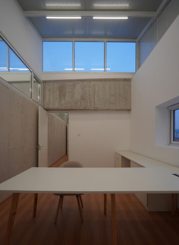 建筑现状为单层建筑,占地160平米,檐口高度为5.8米。高耸的空间尺度,及破损屋面洒下的光感,强烈地吸引着我们,激发了对未来空间的想象;同时我们了解到,园区的定位是将生产性的厂区转换为社区性的文创园,两者合力促使我们将其承租下来作为工作室使用。希望通过设计使孤立的单体对环境氛围能做出积极的回应,使建筑内部与外部社区和外界自然产生多样的空间联系。