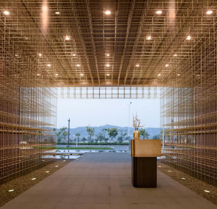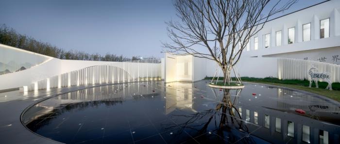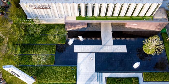 基地整体由前场景观、“L”形主体建筑及后场庭院三大布局组成,形成开敞式的现代中式院落。辅以连廊,步道等传统元素,让整体建筑呈现儒学礼序下的雅致气质。