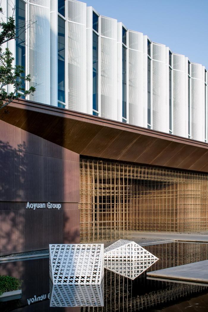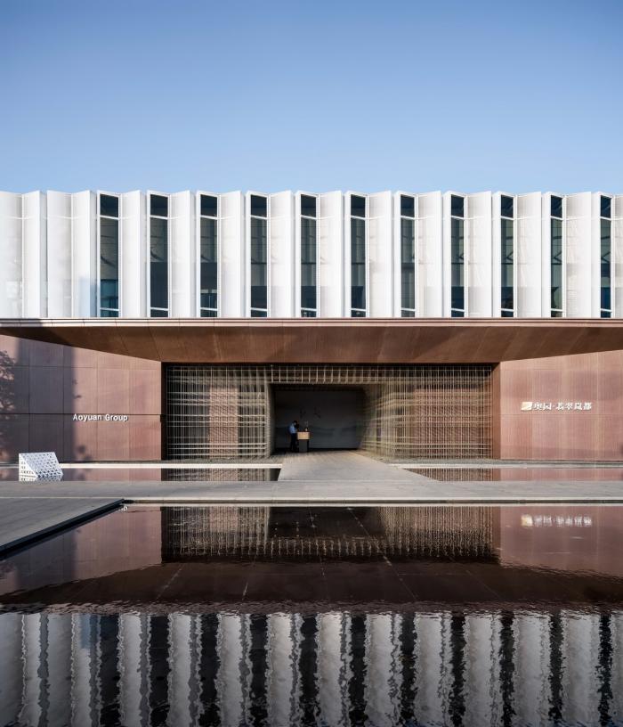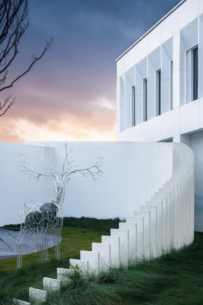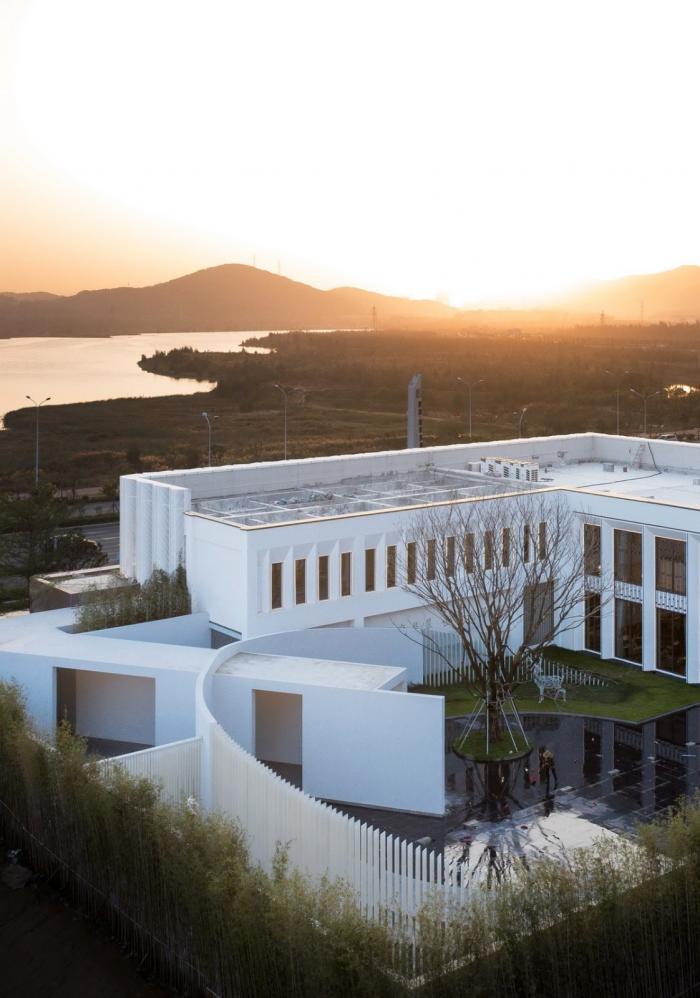 主体建筑以“L”造型呈现出简洁流畅的建筑形态,建筑外立面以白色为整体基调,运用大面积的穿孔铝板,虚中有实,光影交错;以超白玻璃加以点睛,整体造型轻盈现代,运用以物借景的传神手法,将自然景观映衬于主体建筑的立面上,使得建筑与自然相互融合,形成天人合一的现代东方意境。