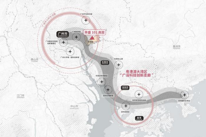 丰盛101项目位于广州增城荔新大道旁,其北侧远眺南香山,南侧遥望广州珠江新城,坐拥粤港澳大湾区和广深创新走廊核心区位优势。该项目与周边交通体系相结合,助力于大湾区一小时生活圈的建设。丰乐集团作为本项目的开发主体,响应大湾区建设需求,秉承着“宜商、宜创、宜居”的理念,致力于打造出一座融合集团总部办公,星级酒店,时尚商业,与花园式居住环境的综合体,为大湾区人才构建一种自由、舒适,优雅的空间载体。