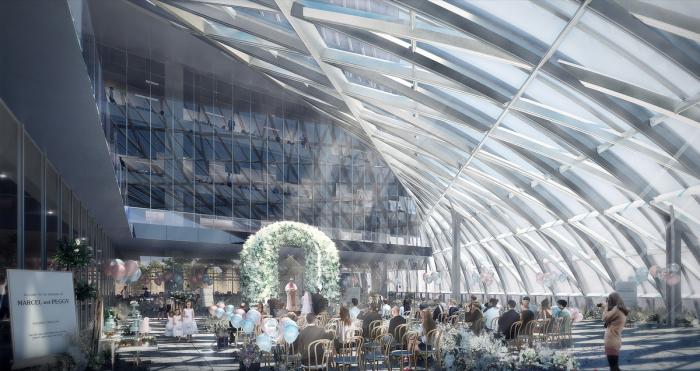 立面处理的另一巧妙之处在综合体的塔楼和裙楼之间自然优美的过渡,在空中花园平台与裙楼衔接的地方塔楼外立面顺延而下,形成一个曲面的天幕造型,天幕之下形成了开阔的多功能空间,既可举办婚庆礼仪、亦可作为餐饮、展陈空间、创造了一个理想的公共活动场所。