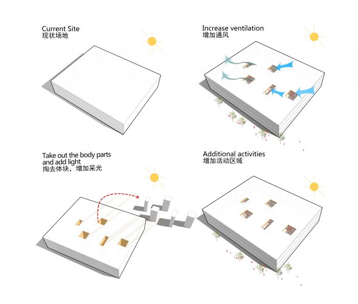 此园所是基于现有的建筑物改造而成,由一个进出口贸易中心改造而来—— 拥有清晰的规划结构,简单的建筑外观,起初处于废墟状态。经过漫长的实地勘察、测绘,等诸多信息,我们试图呈现打破边界,将自然的元素以一种非自然的形式表达,尝试寻找关于此幼儿园的无限可能。