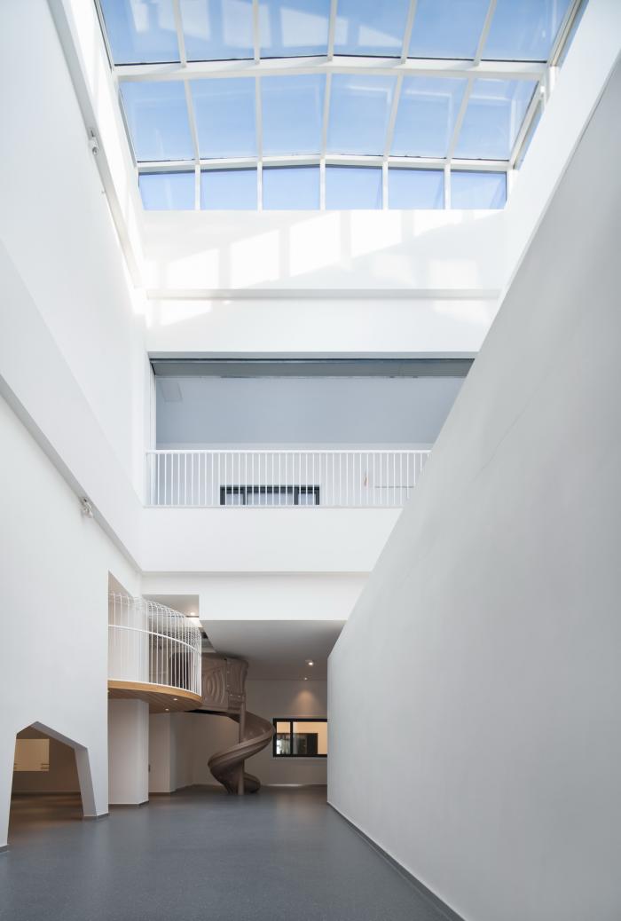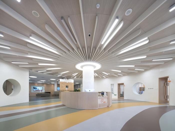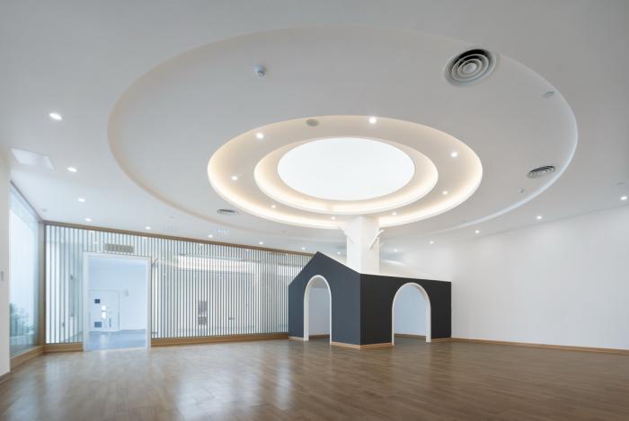 每一个窗子都代表了一个梦,此幼儿园的建筑外形,通过大大小小的、高高低低的窗子布局、让一道道阳光透过窗子打进来,与大厅内象征太阳的造型设计遥相呼应,相得益彰,当孩子们站在楼顶俯瞰,建筑、人文、自然、都以不规则的多变形区域呈现,互相分离又紧密相依,这也是一所孩子们的精神栖所。