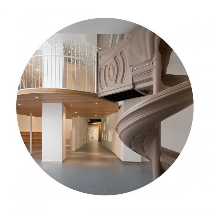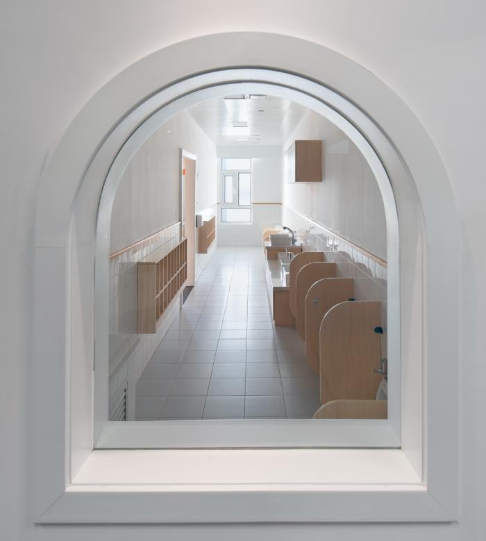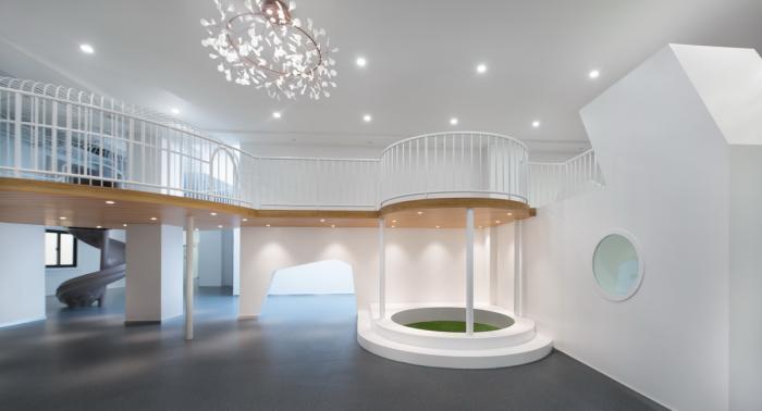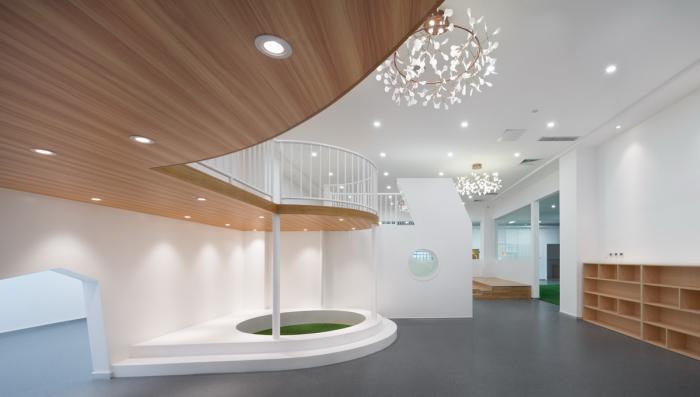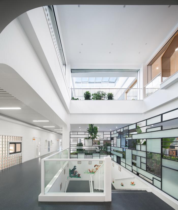 摒弃以往幼儿园中常见的斑斓彩色,以白色为主基调,少许绿植作点缀,隐隐透着春天的气息里,干净而纯粹的空间给予视野无限的放空与遐想。