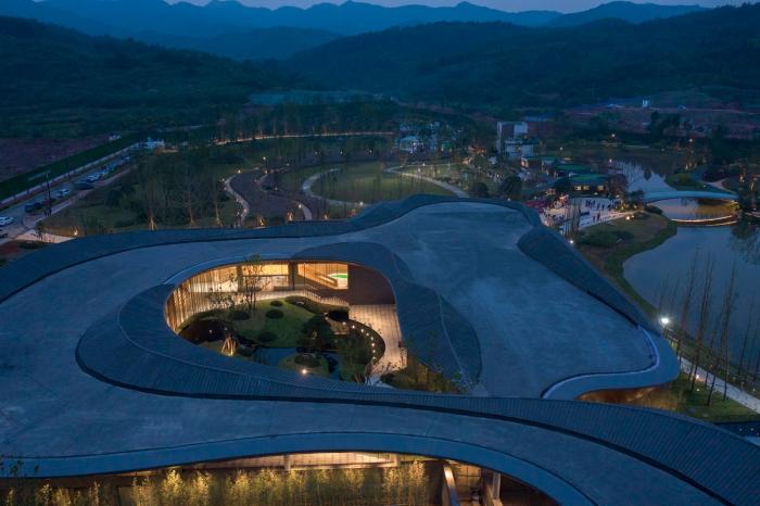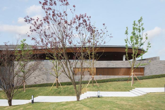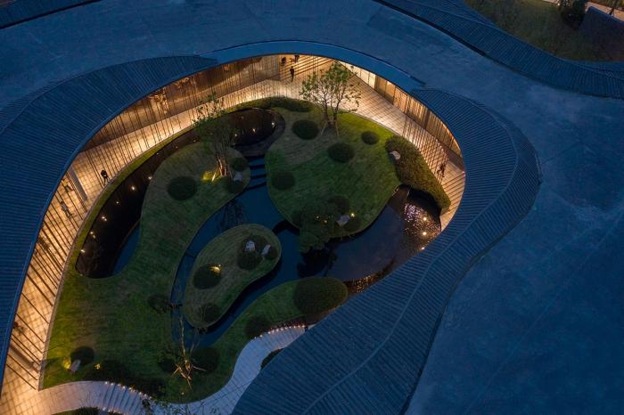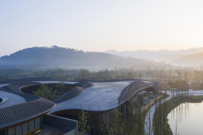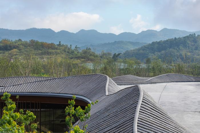 这时,游人可以看到湖面与远处的龙泉山脉,这个视线游移的过程也造就了建筑屋面与周边山水景观之间的不同场景。这种环状上升的建筑形态,使得人们可以站在建筑外侧透过屋顶看到内庭空间及立面,形成介于建筑立面与顶面之间的观察视角。