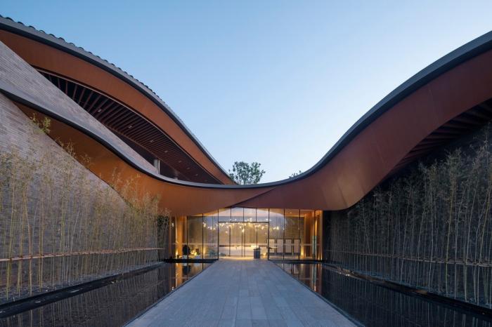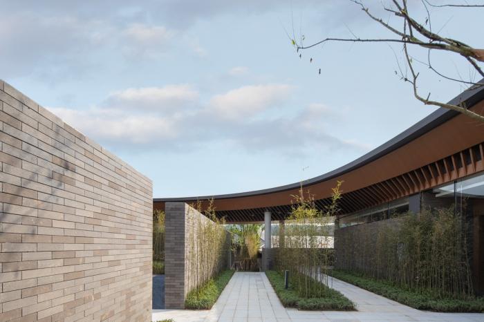 自入口竹林进入场地,在景观的掩映中,会经过一系列沿湖景墙。流动的飞檐串联起墙体与景观以及临湖的框景茶室。沿湖而行,南面的建筑形态与路径相关联,步移景变。行至展示前厅入口,两侧不同标高的檐口在此交汇。