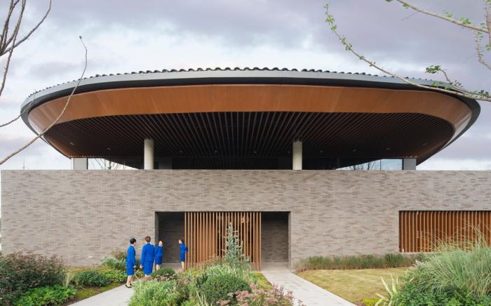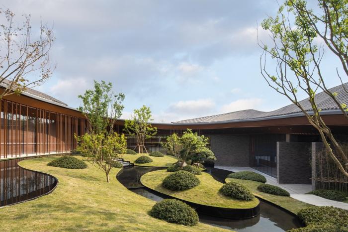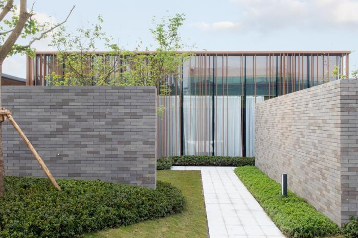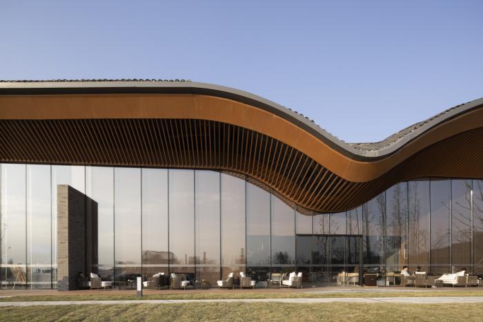 在建筑的大屋面下,一系列由通透幕墙围合而成的正交空间,满足了功能的实用性、建造的便利性需求,形成了面向湖景、内庭院的景观视野。设计师在玻璃体之间及檐下设计一系列灰空间,通过景观灰砖墙体形成对视线的遮蔽、引导,并产生框景,从而为游人带来了丰富的建筑空间体验。建筑的形式逻辑与周边景观高度统一融合。