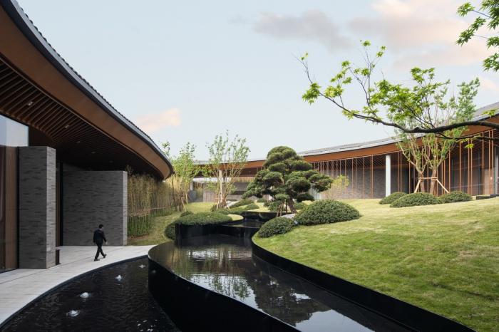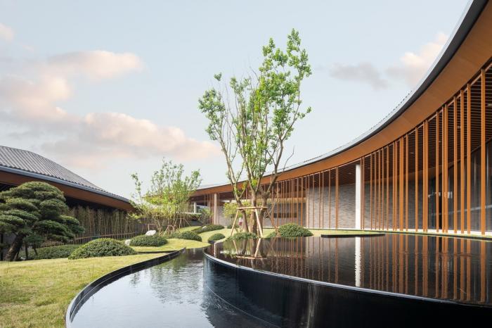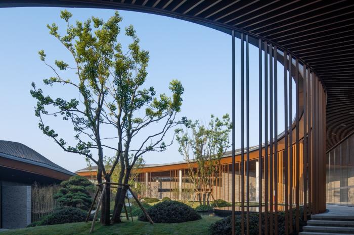 建筑外界面由挑檐和通透的幕墙构成,突出建筑屋面本身的形式感,以及其与周边山体景观的呼应关系。在建筑的内庭院,檐下设置了一圈仿木格珊,强化了内庭屋顶弧线的同时,营造出具有一定通透性的私密禅意内庭空间。
