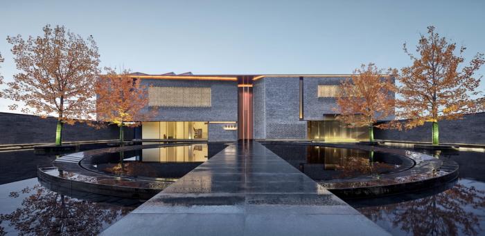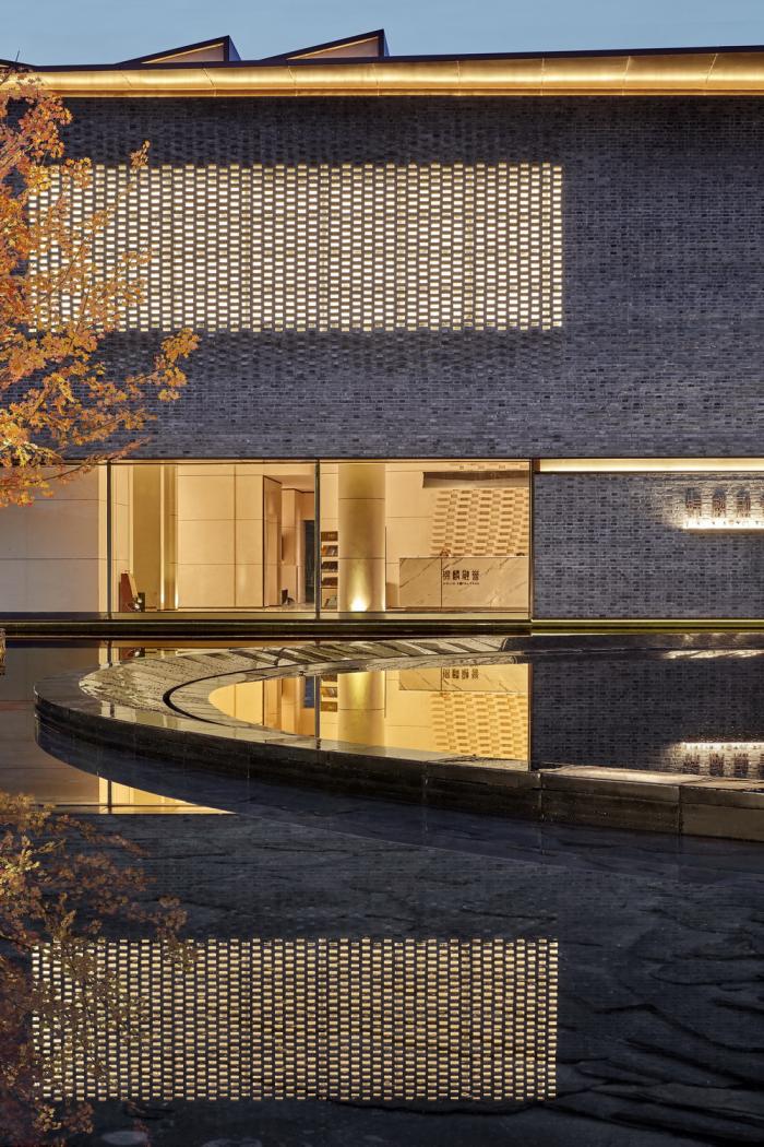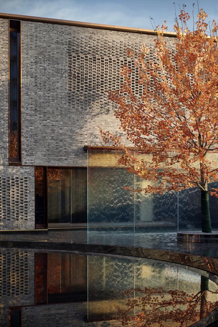 砖法变幻在扩展实墙面细节的同时,也随白昼之时间行进而产生丰富的光影变化,在前场的恬然静谧之中,青砖、红铜、橘光、水瀑,随四节更迭而隽永深刻,随朝晖夕阴而气象万千。