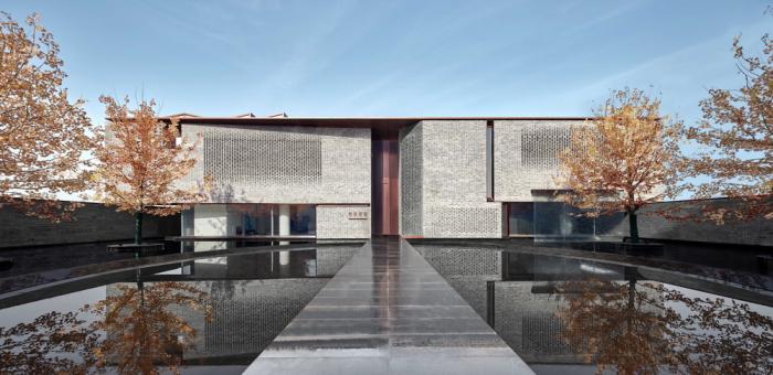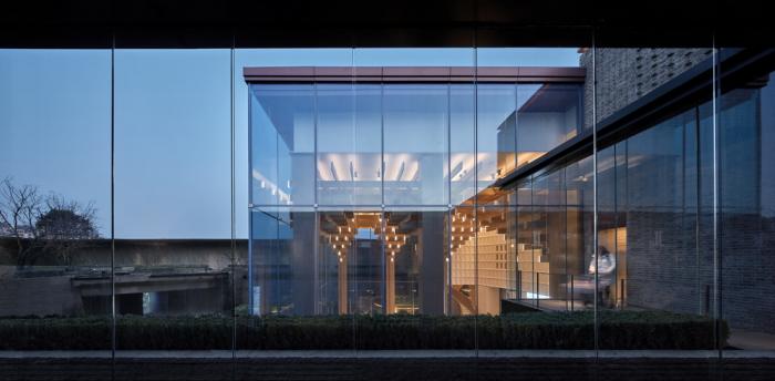 如果说传统的符号是一种历史的载体,那么工业化现代化的今天,玻璃正是浓缩了二百年现代化进程的时光载体。光洁通透的玻璃幕恰到好处的与粘土青砖的粗砺坚实呈现对比,更使现代与古朴更加相得益彰。