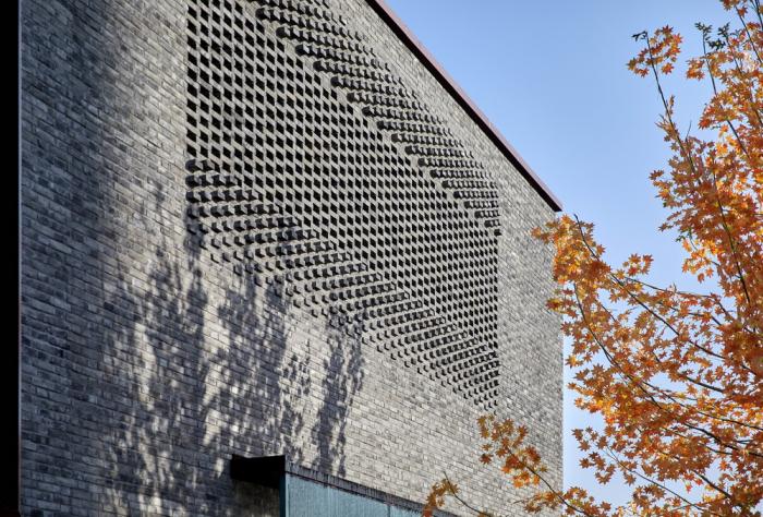 对民族古老的记忆中的 “砖”的理解和运用,我们并没有停留在它所呈现的封闭的墙体上,而是去探寻一种新方式去创造文化新价值。在青砖的砖面中,我们又通过渐变、凹凸、镂空等砖砌法的变化,为立面增加更深一层级的虚实对比,并对其比例与位置反复进行推敲,最终确定最合适的分布比例。