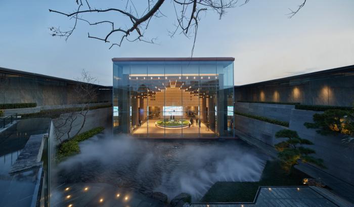 前场则通过方与圆嵌套的景观浅水池来打造 “天圆地方”之概念,寓意“卷展乾坤”,我们希望用这些古元素去打造全新的文化体验。