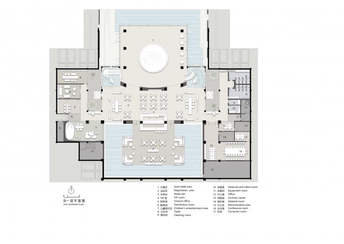 通过旋转楼梯下至负一层,空间豁然开朗,人的感知被空间的作用力放大且延伸。天光充盈于中,感知微妙且敏感,视线所及,斗拱悬吊顶,沙盘气恢宏,天光映云影,曲径绕婆娑,这一些都为参观者打造出一种时空变换的体验。