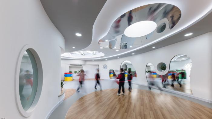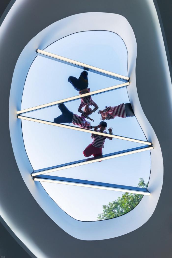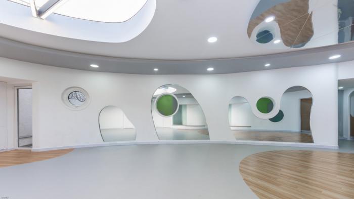 建筑在墙面上设置了三扇不同造型的“豆苗镜”,满足舞蹈房的需求。镜子的形状呼应了平面的曲线,镜面反射也放大了空间的尺度。室内通过大小不一的圆洞,以及局部吊顶的镜面反射和圆形的天窗,模糊了室内的边界,增加了空间趣味性。