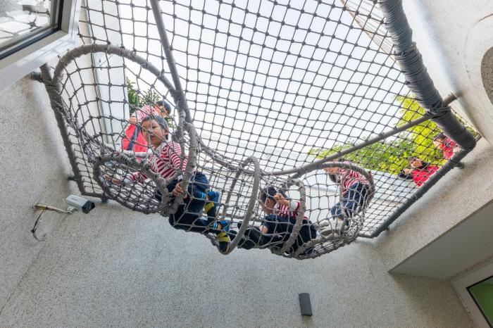 小孩子乐于奔跑,喜欢探索,在考虑孩子们活动特点的前提下,设计保留了L型的围合形式,植入了一个豆荚空间,圆弧形墙壁包裹下的空间可以充分释放出孩子们的活力。豆荚空间给师生提供多类型活动的可能,在豆荚空间外的负空间则赋予储藏、更衣盥洗等辅助功能。西南侧的角落设置了一个庭院,给内部提供良好的通风,同时,庭院上方设计了攀爬网,在满足安全防护的条件下给孩子们提供探险的角落。