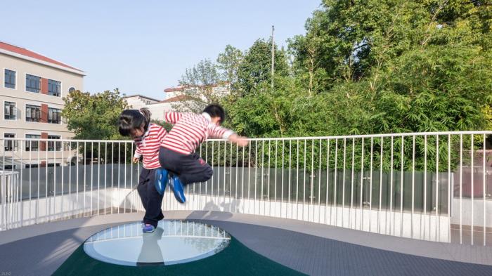屋面延续了豆荚的造型,为孩子们设置了环形屋顶跑道和游戏场地。两个屋顶天窗为豌豆屋提供了足够的采光,圆形天窗设计了小爬坡,豆荚形天窗作为小朋友探索的玻璃道。天窗形成的视线关系让室内外孩子们的对话更为有趣。