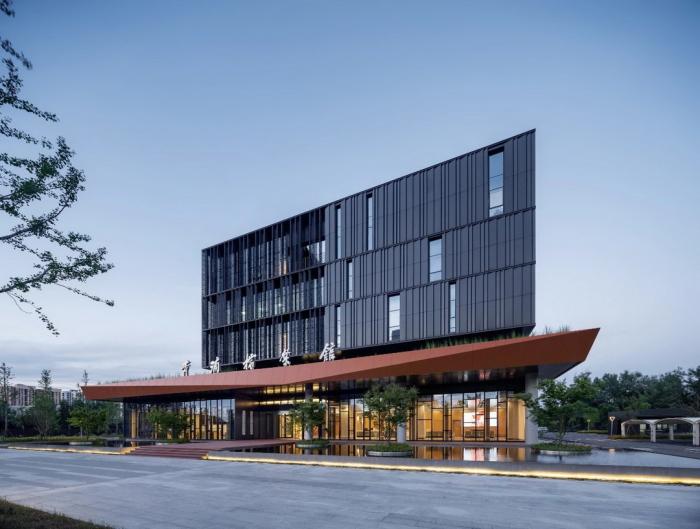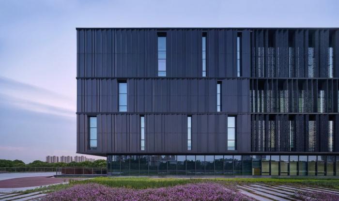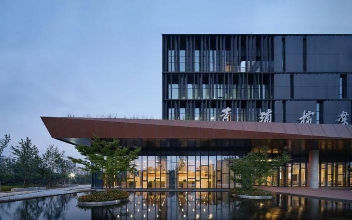 青浦档案馆作为城区景观核心中的重要建筑,在创新与继承地域建筑风格中做了 一些探索。借取江南建筑色彩以 灰、白 、黑为主的色调,局部辅以亮色。通过对材料的质感 、色调的选择及多种材肌理之间的搭配, 形成 透明、半透明 、不透明的视觉效果,来表达江南地域建筑文化的层次感 、朦胧感 、多义性 。