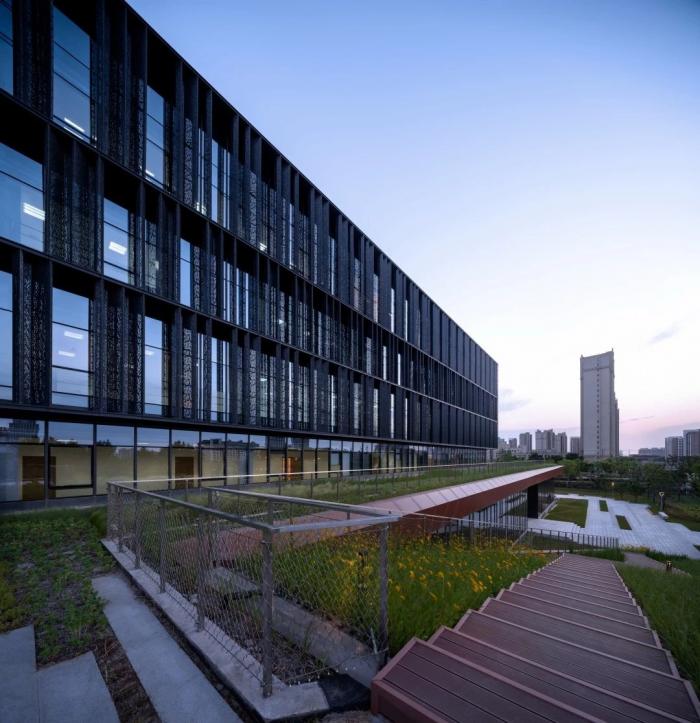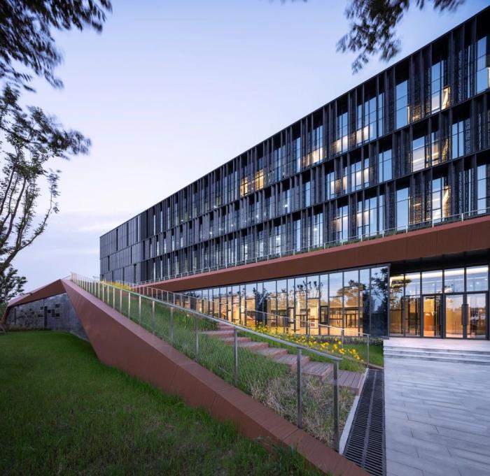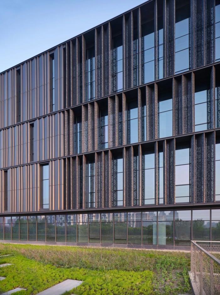 档案馆办公部分西侧立面采用落地玻窗外加石材百叶的处理方法。一方面满办公室采光要求,同时也能很好地享受到西侧城市生态绿轴的景观资源。另一方面外挂遮阳石材百叶也能有效的起到被动式节能的功效。