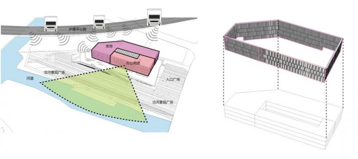 办公用房位于北侧,可以享受优越的沿河景观。其中二层会议空间可达首层屋面延伸形成的观景平台,南向及东向背水面 、库房位于东南侧,隔绝了沪青平公路的噪音。