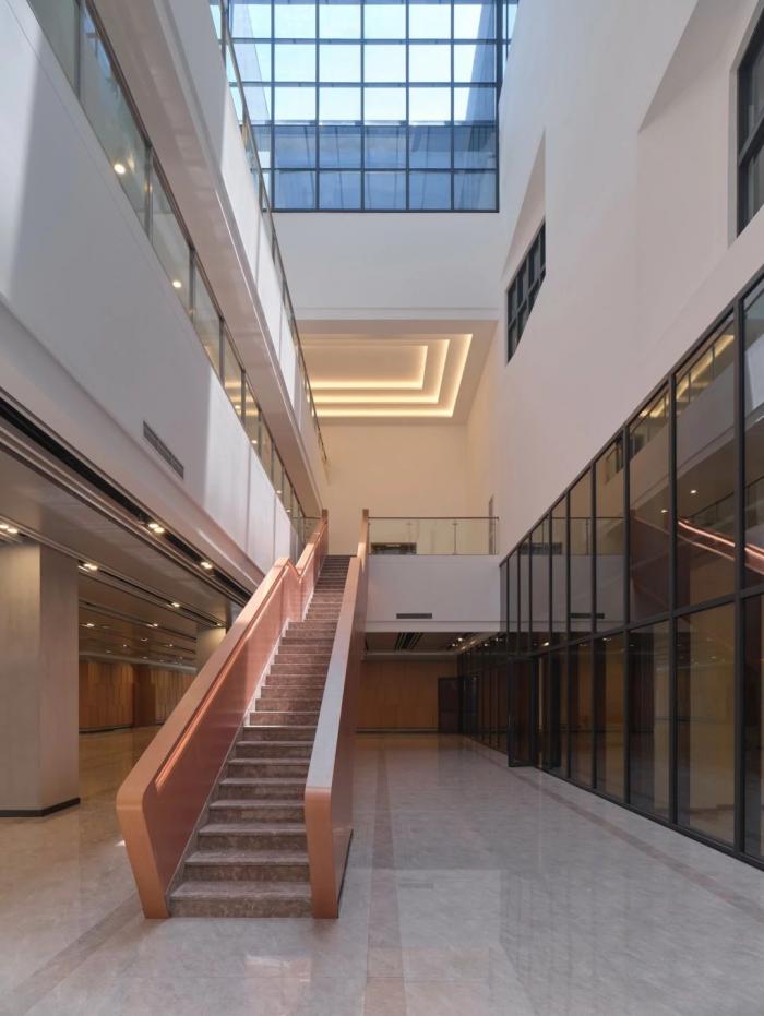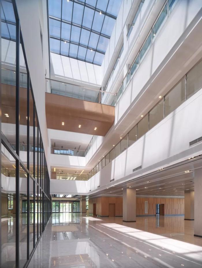 通过功能的复合叠加,对档案馆进行紧凑集约设计,同时仍然注重内部空间的趣味性与体验感。在建筑内部打造狭长型的通高中庭——光阴之庭 。不仅解决了大进深建筑的采光问题,同时也能改善室内微气候。