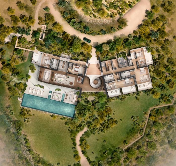 项目基地位于土耳其西南侧穆拉市的爱琴海沿岸,这个私有的Dolunay庄园在布置上充分考虑了当地的自然地理条件,以获取最壮观的海景视野。庄园可以从场地的北侧进入,通过一条蜿蜒的道路就可以抵达庄园的下车点。建筑师充分利用了场地的基地条件,设计了一栋低矮的建筑,使其在一侧看去只会呈现出一层的样式。