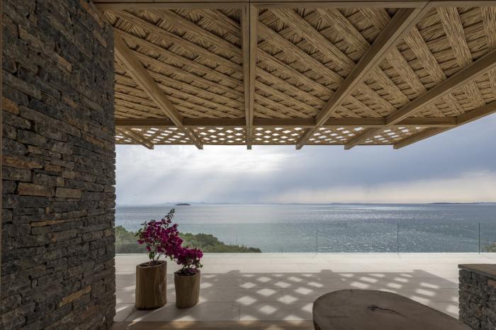 整个别墅内部的元素设计都满足了业主所提出的特定需求,从手工制作的实木大门,到定制的浴室瓷砖和面盆,无一不体现了项目所具有的极高手工艺精神。同时,建筑师还在海岸边设计了一个日落凉亭,以自然石块砌墙,弯曲竹片为结构,搭配橄榄树和木桌。